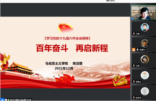 陈泊蓉讲师是马克思主义学院中国近现代史教研部教师,教育学博士,2020年获陕西省思政课教师“大练兵”活动“教学标兵”荣誉称号。在此次宣讲中,陈泊蓉分别从深刻认识总结党的百年奋斗重大成就和历史经验的重大意义、深刻认识党的百年奋斗的初心使命和重大成就、深刻认识中国特色社会主义新时代的历史成就、深刻认识党的百年奋斗的历史意义和历史经验、深刻认识以史为鉴开创未来的重要要求、从党的百年奋斗历程中汲取智慧和力量等六个方面就党的十九届六中全会精神进行了深入浅出的宣讲。陈老师的宣讲内容丰富,与会教师纷纷表示受益良多。