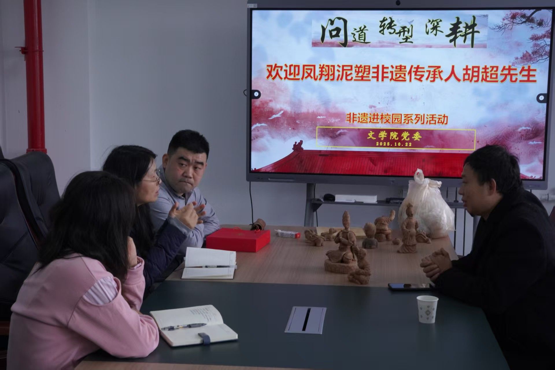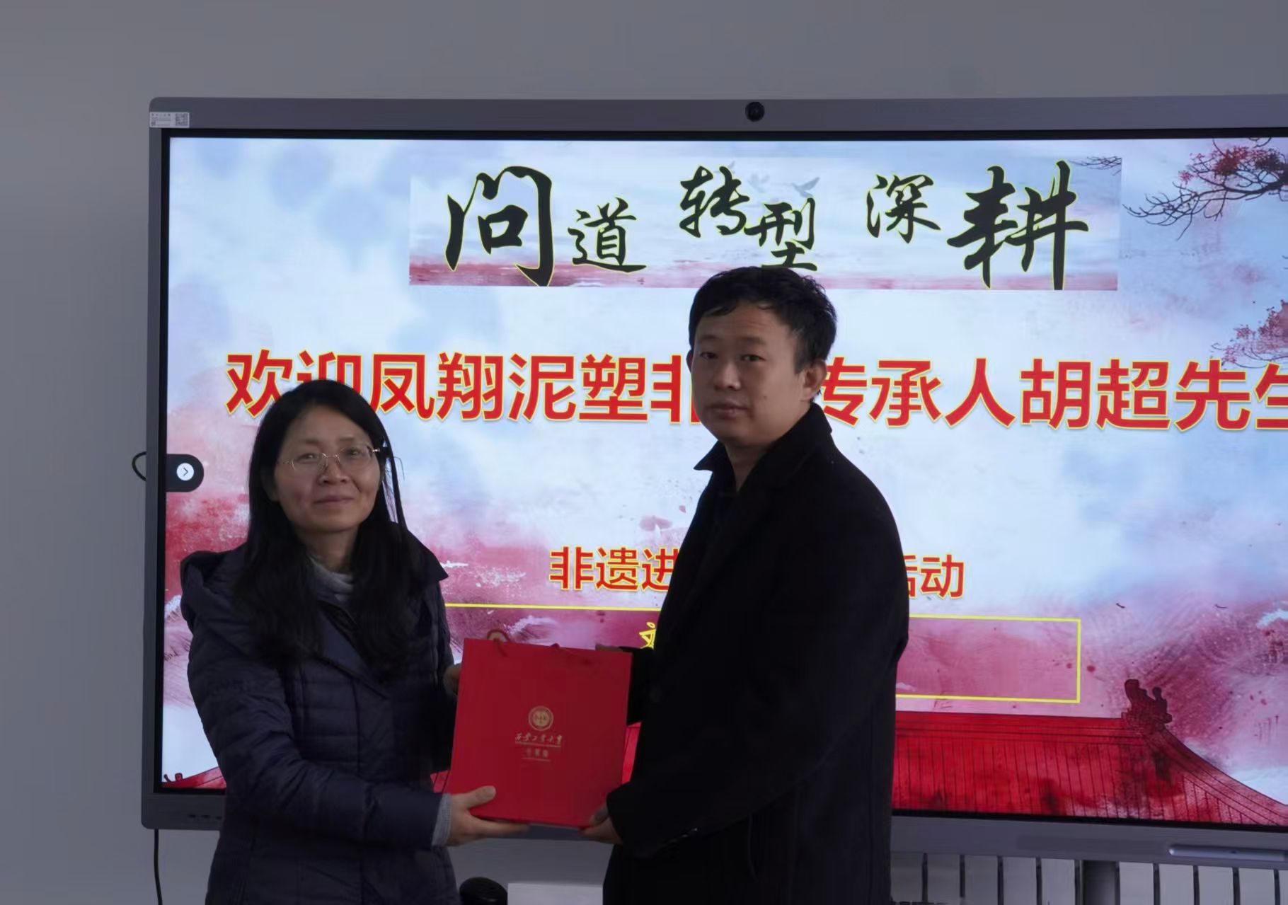 为扎实推进“标杆学院”创建工作,切实推动党建工作与教学科研、人才培养同频共振、深度融合,积极响应“非遗进校园”文化号召,10月22日上午,学院特邀国家级非物质文化遗产凤翔泥塑代表性传承人胡超先生莅临交流座谈。副院长吴妍妍、组织员王嘉、团委书记王丹丹以及师生代表共同参与了本次活动。