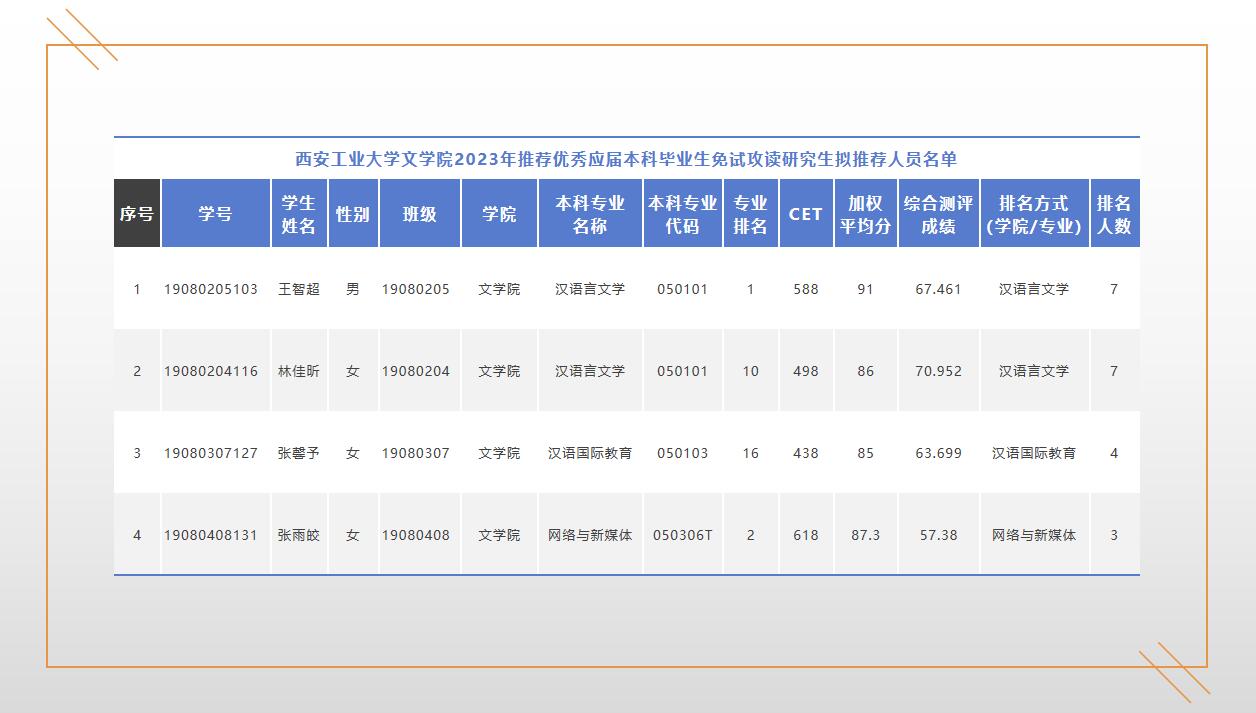 2023年拟推荐优秀应届本科毕业生免试攻读硕士研究生候补(共4人)名单如下: