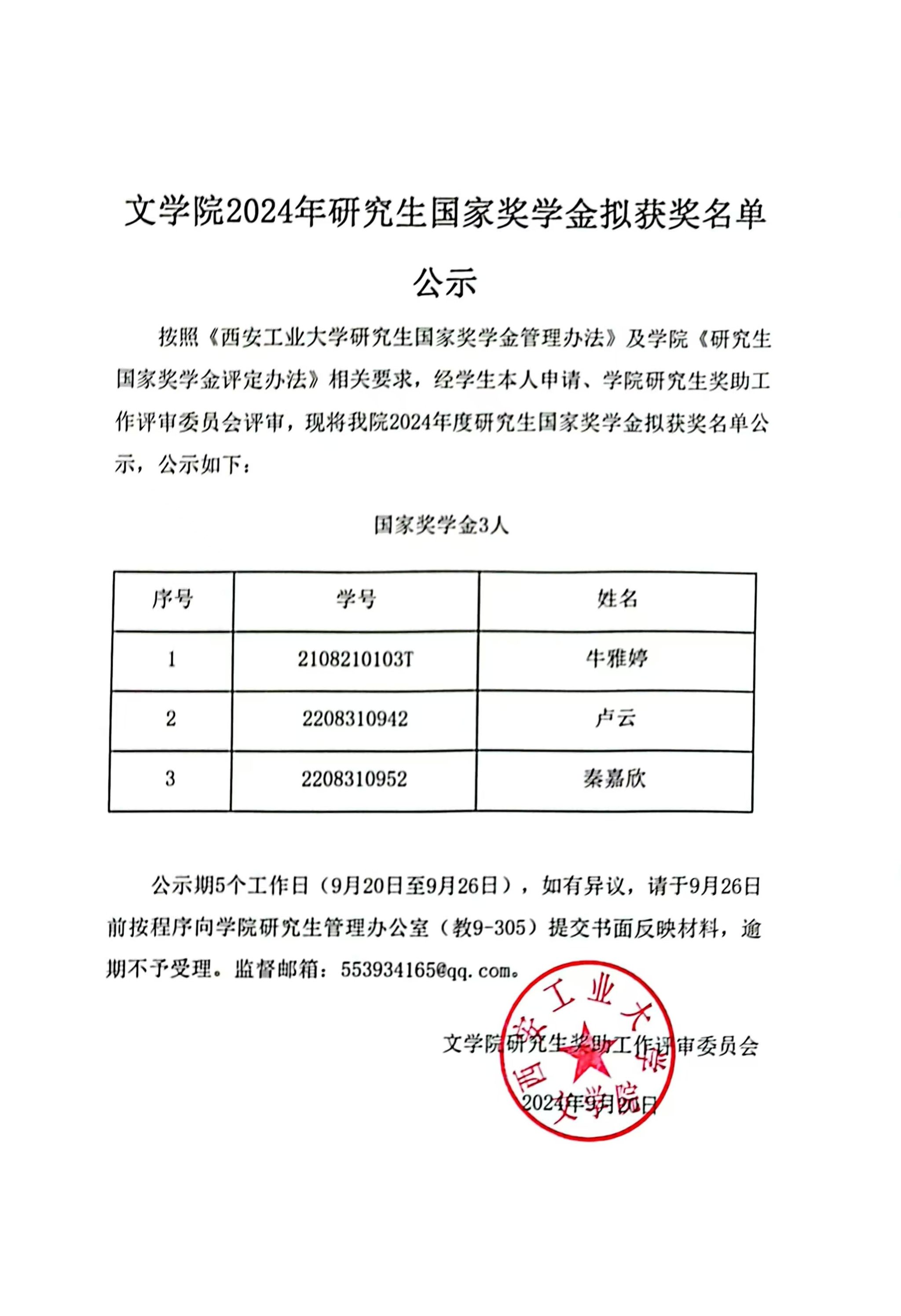 快猫短视频 2024年研究生国家奖学金拟获奖名单公示