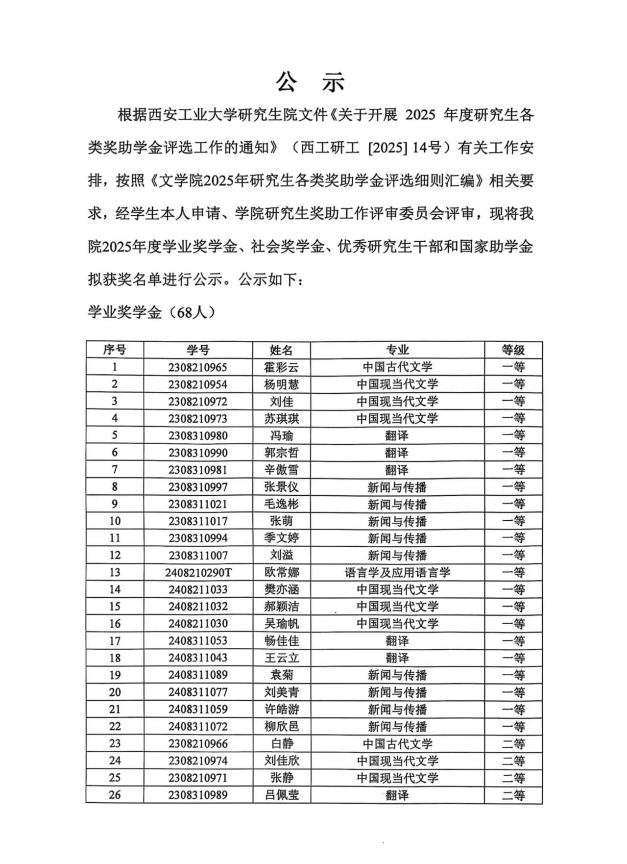 快猫短视频 2025年度研究生晨露奖学金、学业奖学金、社会奖学金、优秀研究生干部和国家助学金拟获奖名单公示
