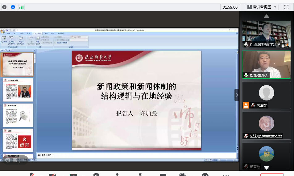 未央大讲堂邀请陕西师范大学新闻与传播学院院长、数字传媒技术国家级实验中心主任、三级教授、博士生导师许加彪通过腾讯会议的形式做了题为《新闻政策和新闻体制的结构逻辑与在地经验》的讲座。讲座由我校快猫短视频