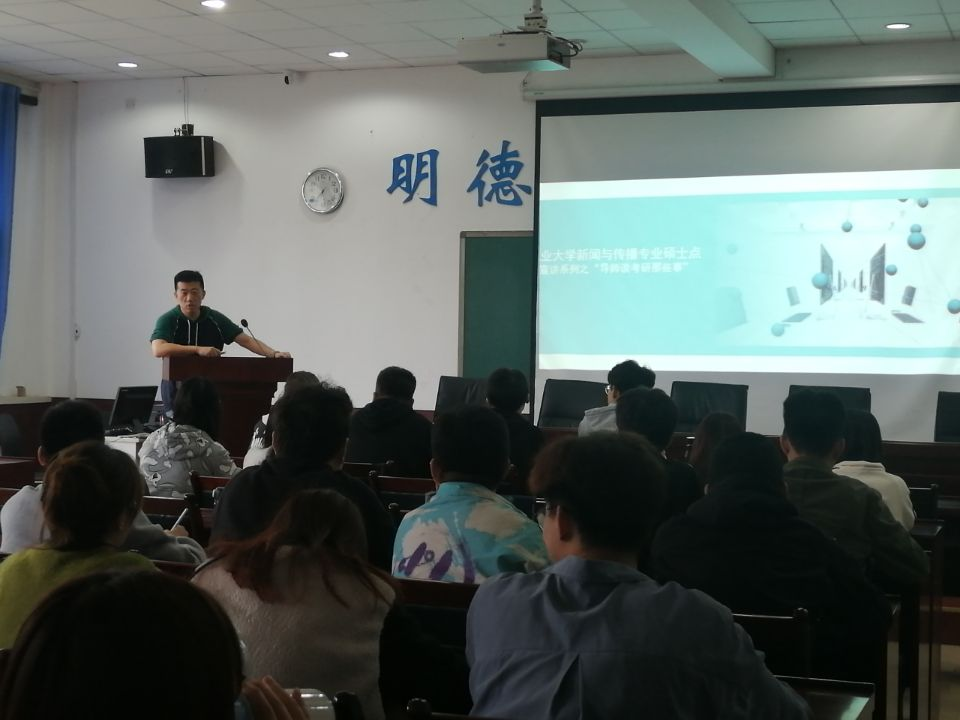 研究生招生宣讲会。学院党委副书记张郁、翻译专业雷华老师、新闻与传播专业刘磊老师、中国语言文学专业王凌老师以及2018级学生参加了此次宣讲会。