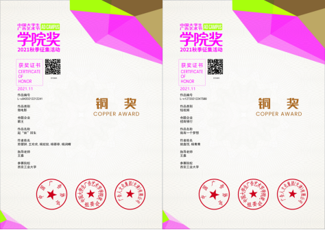 12月12日,中国大学生广告艺术节学院奖2021秋季征集活动青春盛典在厦门国际会展中心圆满落幕。此次赛事中,学院取得优异的成绩,共获得全国铜奖(三等奖)2项、优秀奖10项、入围奖23项。