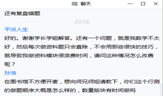张力元同学首先分享考试心得,他结合自身备考荥阳市税务局公务员的经验给师弟师妹们提出了关于复习备考、考试心态以及选岗位等方面的建议。其一,不打无准备之仗,在备考过程中需要不断刷题、模拟,建议准备电子版的错题本,及时复盘。其二,备考是一段较长的旅程,无论是在基础复习阶段、强化训练阶段,还是最后冲刺阶段都应保持良好的心态,把每一道错题当做一次积累。其三,选岗位时注意限制条件越多的岗位报考人数越少,上岸概率较大。