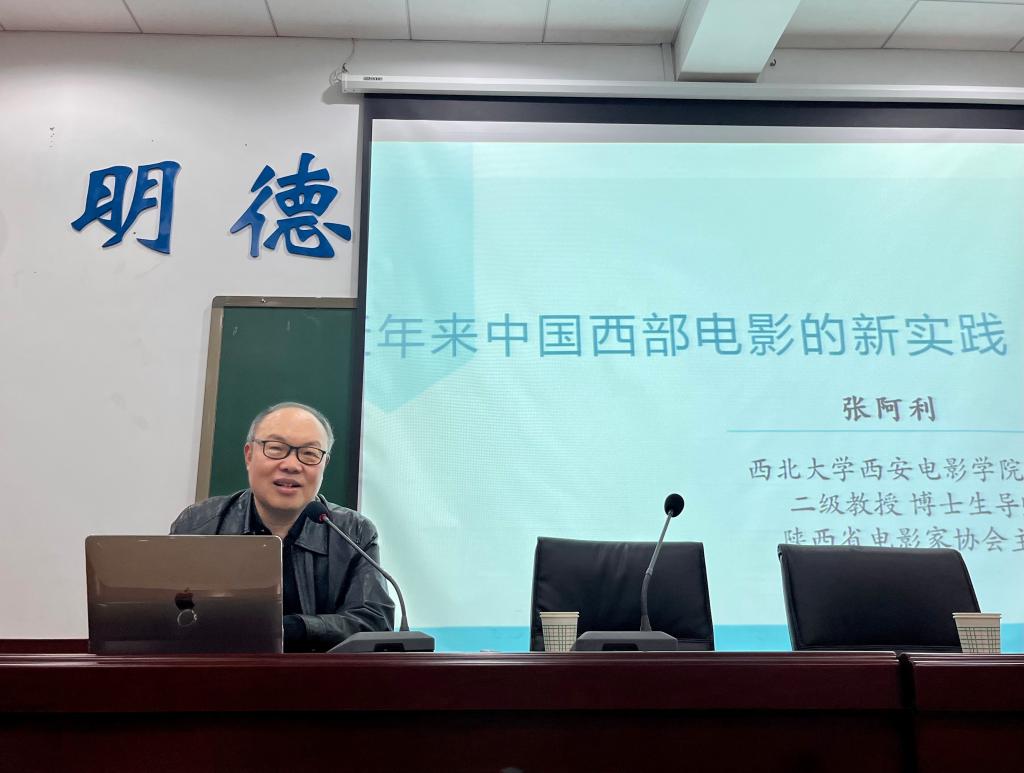 讲座伊始,张阿利教授分享了自己的学术生涯及科研经验,为师生们确定研究方向以及规划学术道路提供了宝贵的经验和启示。接着介绍了中国西部电影的特征,即地域风情、民族韵味以及现实主义创作风格,这些迥异于其他风格和流派电影的特征使中国西部电影卓尔不群,有利于构建中国民族电影品牌,使中国电影走向世界。张阿利教授同时分析了新时代以来,中国西部电影在承续已有美学风格的基础上呈现的新面貌,在生态题材的拓展、现实主义题材的诗意表达、乡土叙事的新范式、反思“现代性”困境以及“人民性”探索等方面开展实践,提升了中国电影的国际共识;强化了乡土书写的美学因素;增强了中国电影的实践性、现实性与人民性;彰显了中国电影的民族品格;丰富了中国电影的电影语言谱系。他指出,当下中国西部电影应以民族性、地缘性和时代性三个精神坐标规划未来发展方向,通过构建民族审美,表达民族文化,实现中国电影主体性表达,提升中国西部电影的地缘性创作,表达时代主流声音,讲好中国故事,展示可信、可爱、可敬的中国形象。