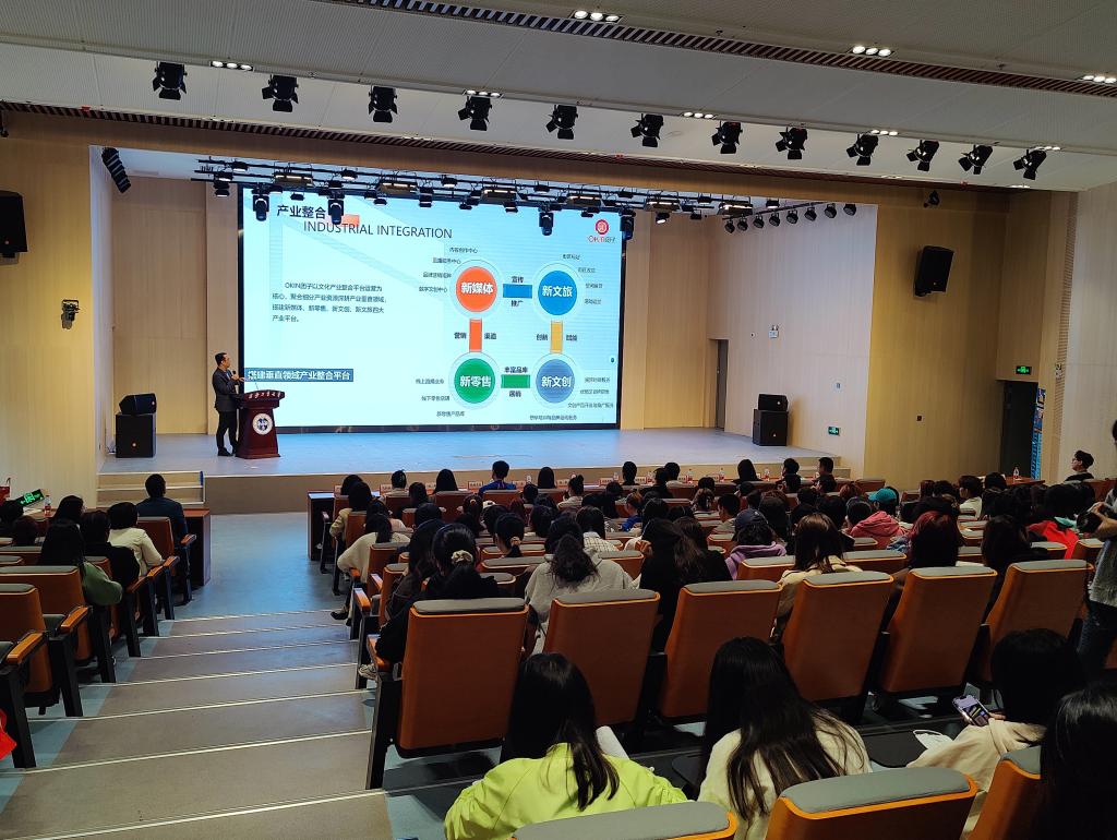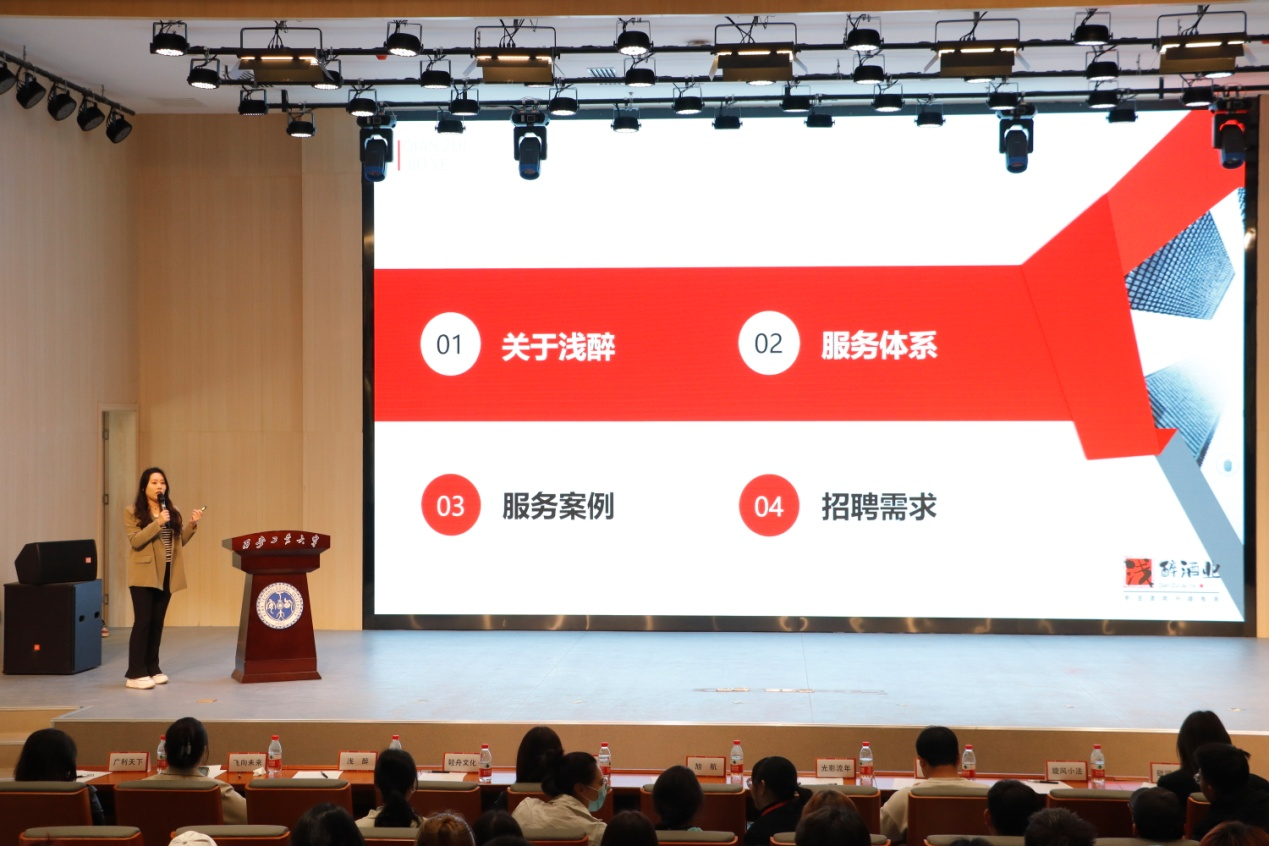 就业工作的支持。随后团子公司总经理张策做了简短而精彩的“文创微课”分享,既有对行业趋势的权威解读,又有最新的文创信息推介,让在场学生享用了一场文创“盛筵”。西安旭航数字科技有限公司、西安轻舟文化传播有限公司、西安曲江品高快猫短视频传播有限公司、西安光影流年文化传媒有限公司、西安月牙影视文化传播有限公司、西安飞向未来智能教育科技有限公司、陕西础润光合传媒科技有限责任公司、陕西浅醉酒业有限公司、西安钢蹦文化传媒有限公司等企业依次进行宣讲,通过宣传视频播放及PPT演示,详细介绍了公司概况及未来发展前景、岗位人员需求、职业发展方向以及选择该公司的理由等,让毕业生们了解西安文创,明确自己的就业方向。年轻的企业家还分享了自己的创业经验,引导和鼓励在场学子突破自我,勇敢追梦。