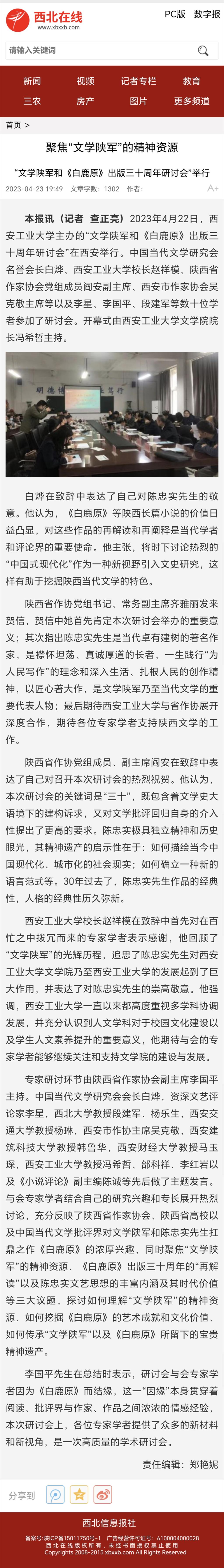 4月23日,西北信息报社新媒体平台“西北在线”刊文《聚焦“文学陕军”的精神资源》,对快猫短视频 举办的“文学陕军和《白鹿原》出版三十周年研讨会”进行了报道。西北信息报及其新媒体平台“西北在线”在西北的确有着重要的社会影响力,该报道也被网易新闻、搜狐新闻等转载报道,在全国、全省、全市产生较强的社会影响力。