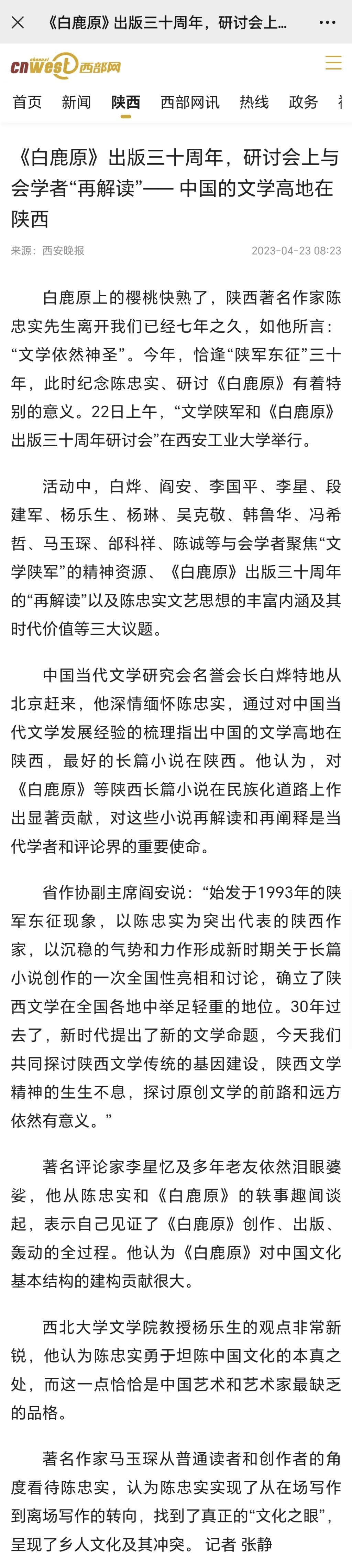 西部网转载西安晚报《<白鹿原>出版三十周年,研讨会上与会学者“再解读”——中国的文学高地在陕西》