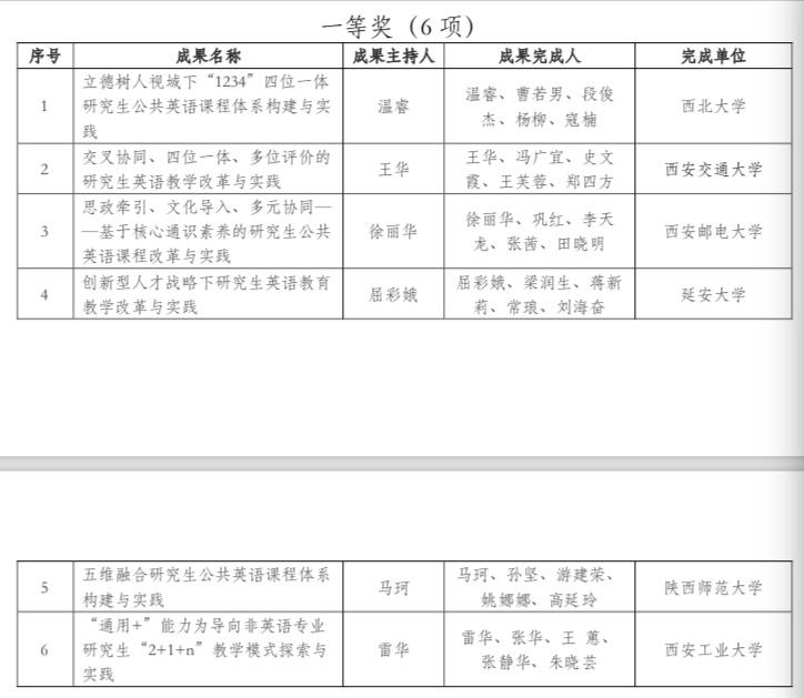 陕西省学位与研究生教育学会外语教学工作委员会评选研究生外语教学成果奖,旨在持续推动我省研究生外语教育改革与发展,探索研究生人才培养模式改革,提高人才培养质量,提升学位与研究生教育水平和改革创新水平。此次共遴选出获奖成果26项,其中特等奖5项、一等奖9项、二等奖12项。
