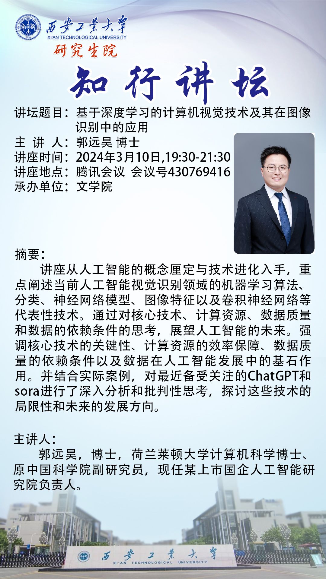 邀请机器视觉研究领域专家郭远昊副研究员,在线为学院各专业学生分享了计算机视觉技术及其在图像识别中的应用。郭远昊副研究员系荷兰莱顿大学计算机科学博士、原中国科学院副研究员,现任某上市国企人工智能研究院负责人。会议由快猫短视频