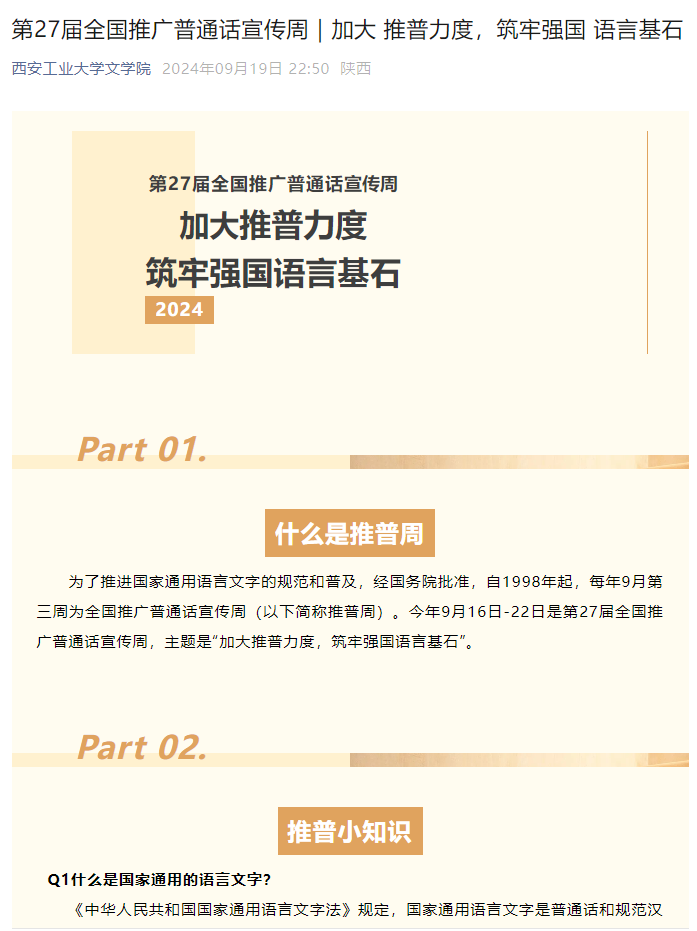 还充分利用了新媒体平台。在文学院官方公众号发布了一系列关于普通话推广的文章内容,包括“推普小知识”“普通话的魅力”等,确保师生能够多渠道、全方位地了解推普知识。这些内容不仅丰富了师生的课余生活,也激发了大家参与至其中的热情,形成了良好的线上氛围,进一步扩大了推普活动的影响力,激发师生对中华文化的热爱和推广普通话的责任感。