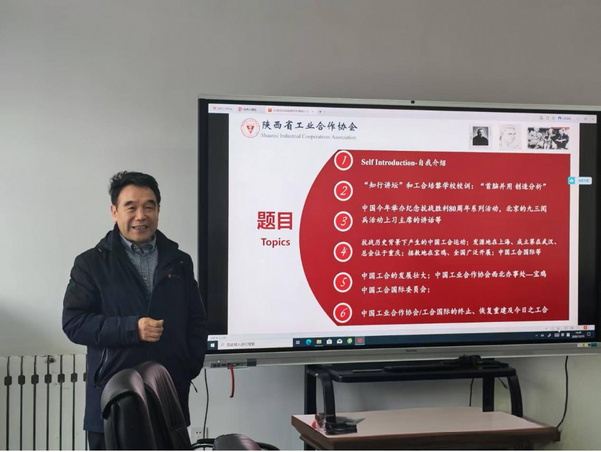 邀请陕西省工业合作协会副理事长兼秘书长秦泉安作题为《纪念抗战胜利80周年暨抗战时期的中国工合运动》的讲座。讲座由学院副院长吴妍妍主持,部分师生参加。