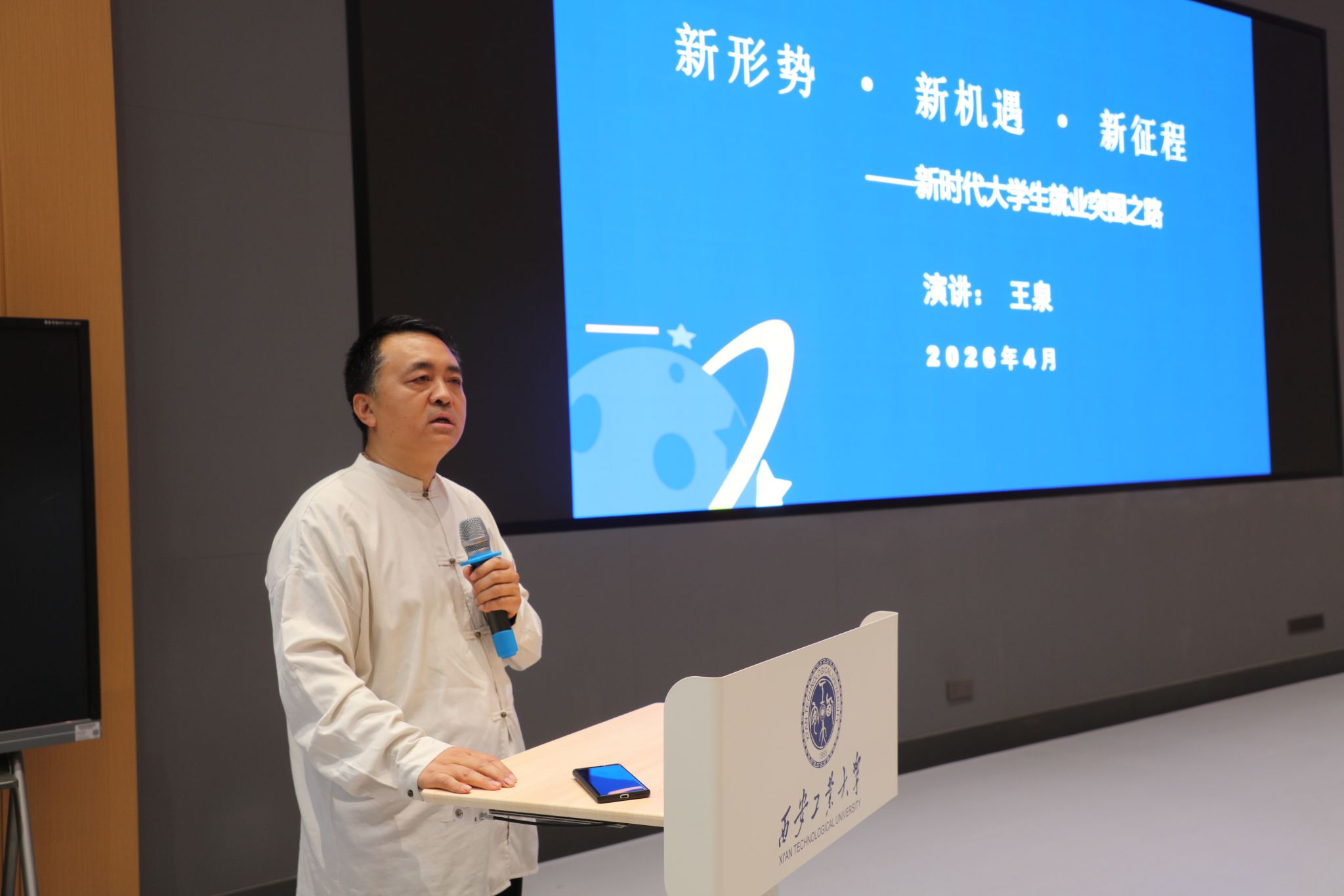 随后,协会副会长、技术委员会主任王泉以“新形势、新机遇、新征程”为主题,围绕“洞察宏观趋势、把握市场脉搏、重塑职业认知”三个方面展开分享。他首先立足当下人才市场的现实境况,指出“就业难”的本质是结构性的能力匹配难题,尤其面对AI技术加速渗透各行各业,传统岗位边界正不断被打破与重塑。他强调,清晰的职业目标是行动的起点,建议同学们尽早确立方向,并通过参与科研项目、行业实践、竞赛活动等方式积累扎实经历,在实战中锤炼解决真实问题的能力,让简历不仅呈现“学习经历”,更讲述“能力故事”。