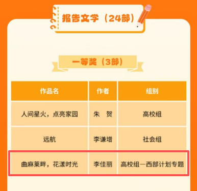 李佳丽同学凭借作品《曲麻菜畔,花漾时光》紧扣志愿精神,以细腻笔触描绘新时代青年奉献身影,从全国近1.7万件投稿中脱颖而出,荣获报告文学赛道全国一等奖。