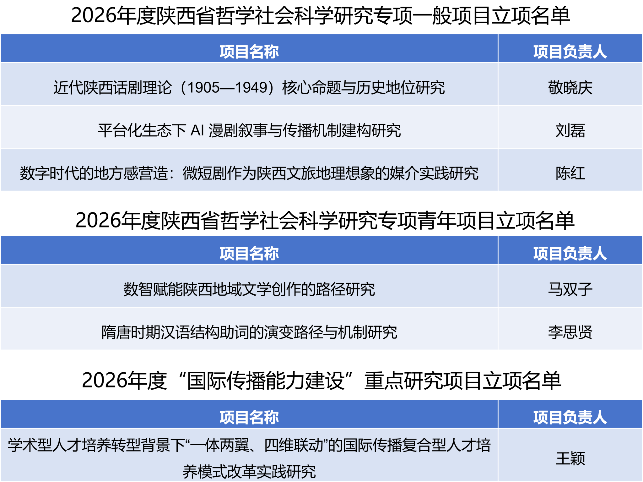 日前,陕西省社会科学界联合会先后公布了2026年度陕西省哲学社会科学研究专项立项名单及2026年度国际传播能力建设重点研究项目立项名单快猫短视频 共有6课题获批立项。据悉2026年度陕西省哲学社会科学研究专项中,快猫短视频 立项12项,快猫短视频 立项5项。此外,2026年度国际传播能力建设重点研究项目立项1