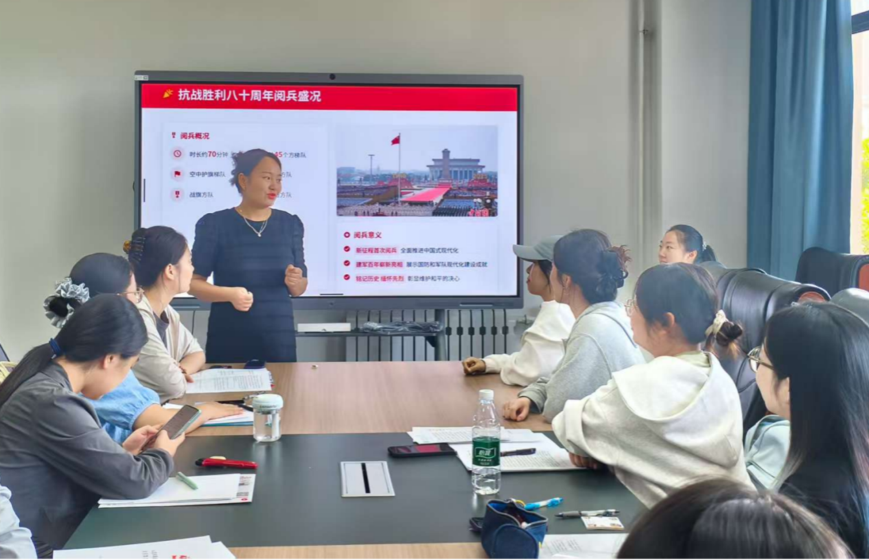 活动伊始,支部书记王丹丹同志带领党员们回顾了新中国成立后23次阅兵的历史知识,重点解读了2025年天安门阅兵的重大意义。她强调,2025年9月3日阅兵不仅是对抗战胜利的纪念,更是对中国军队科技强军成果的展示,彰显了国家安全战略的自信和决心。此外,全体党员同志还系统了解了强军思想与国家安全观,明白了强军思想的三大核心是:听党指挥,能打胜仗,作风优良。在党史回响环节,王丹丹带领大家回顾了抗战红色历史,从九一八事变到日本投降的重要历史节点,特别是中国共产党在抗战中的中流砥柱作用,同时讲述了"半条棉被"和"朱德扁担"两个感人故事,与会党员同志们深刻的了解到共产党与人民之间的深厚情谊和党的领导干部以身作则、率先垂范的优良作风。