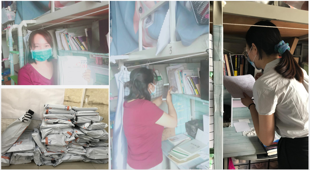 首先,辅导员老师们详细统计了学生所需的复习资料目录,分类整理寄送书籍信息。5月25-28日,在公寓管理员阿姨的协助下,辅导员老师进入学生宿舍,与大四返校的两名学生一起,细心分类、整理、打包、封装所有学生需要的书籍资料,并将其搬运到快递点,联系快递公司,打印快递单号,确保准确无误地将书籍资料寄送到每位学生手中。