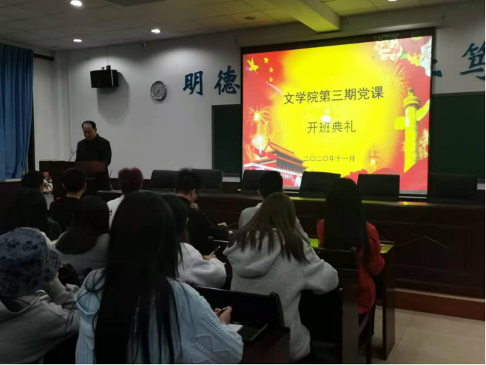 党委书记朱晋中老师致辞。他对学员们提出了三个思考问题:“为什么要加入中国共产党?”,“自己的政治信仰到底是什么?”,“是不是经过了深思熟虑,真正从内心信服、敬仰你所追求的共产主义?”。对在场同学提出三点希望:希望学员认真学习,了解党的基本理论和知识,了解党员的权利和义务;希望学员端正入党动机,树立正确的世界观、人生观和价值观;希望学员严格遵守学习纪律,提高思想素质,珍惜学习培训的机会。
