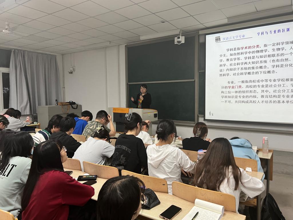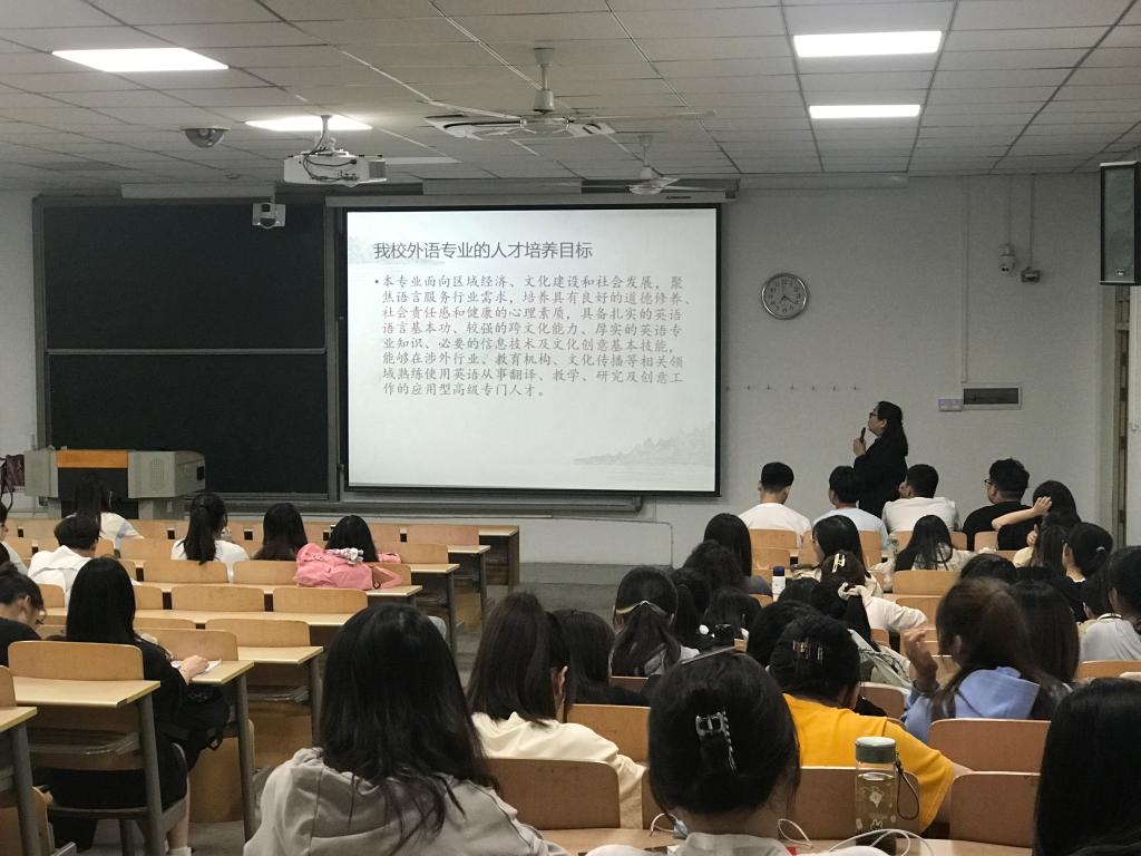 的发展历史、机构设置、学科建设、师资队伍、科研平台、人才培养等基本情况,鼓励学生认真学习,成长为有丰富学识的新时代人才。各专业负责人分别就汉语言文学、英语、汉语国际教育、网络与新媒体专业的培养目标、素养要求、师资力量 、课程设置、就业深造等情况进行详细介绍;并就同学们所关心的学习规划及职涯发展等问题展开深入交流,现场气氛热烈。