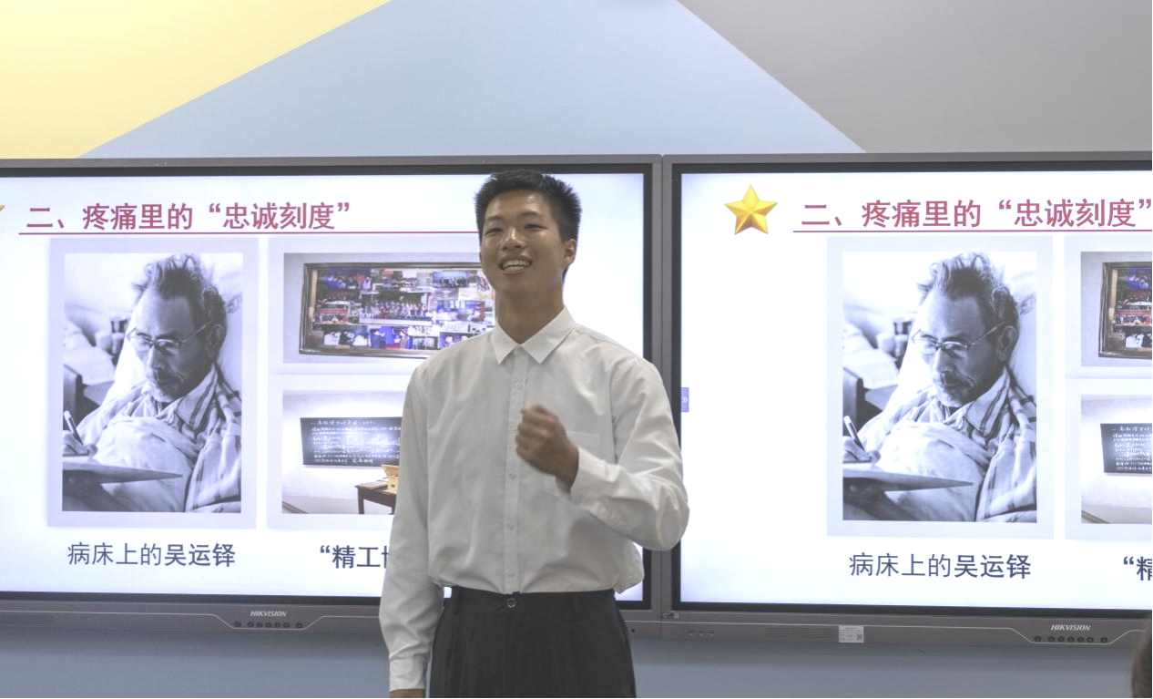 活动在2024级刘俊成的《锈弹克里的心跳》中拉开帷幕,他以“中国的保尔·柯察金”吴运铎的英雄事迹为切入点,深情讲述其在战火中与枪炮弹药为伴、为国防事业舍生忘死的壮举,生动描述了“把一切献给党”的人民兵工精神内核,展现出青年一代对英雄的崇敬之情和对未来的无限憧憬。
