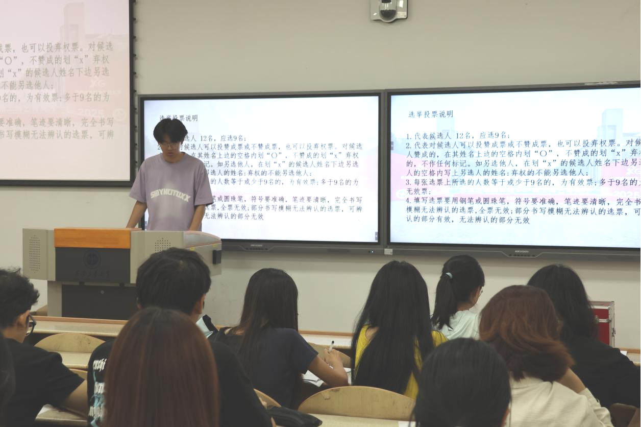 接着学生代表何玺贝走上讲台,为同学们详细讲解了选票的规范填写标准、投票流程及计票方式等内容。何玺贝强调,此次选举采用无记名投票方式,每位同学都要认真对待手中的选票,在选票上慎重勾选自己认可的候选人,确保投票的公正性和有效性。